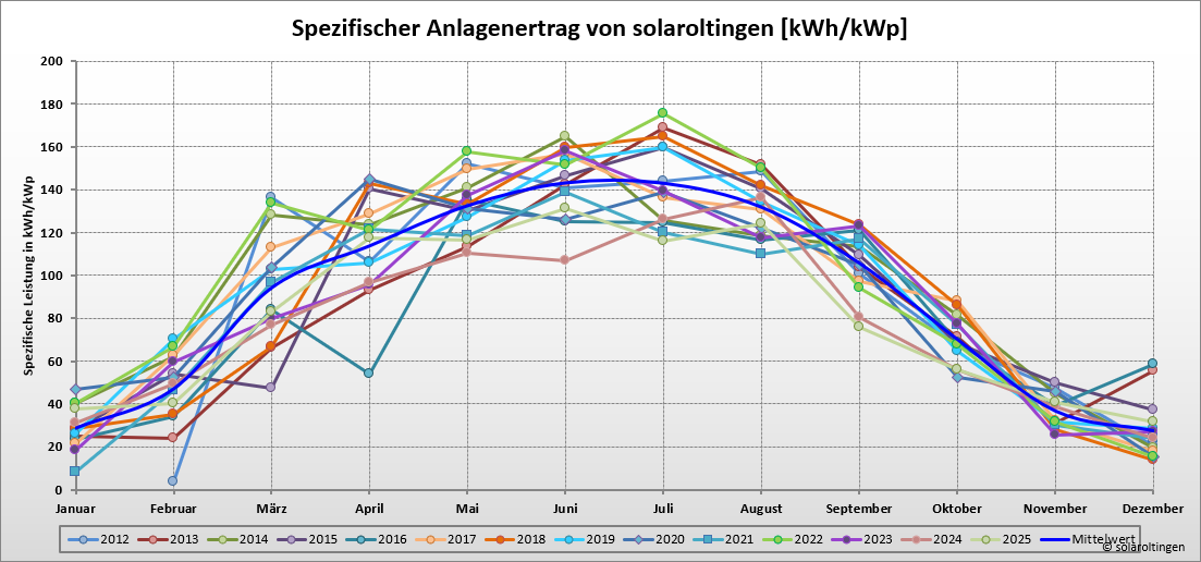 Aktualisierte Jahresvergleiche der Monats- und Jahresdaten des spezifischen Anlagenertrags, Stand 01. Januar 2025: