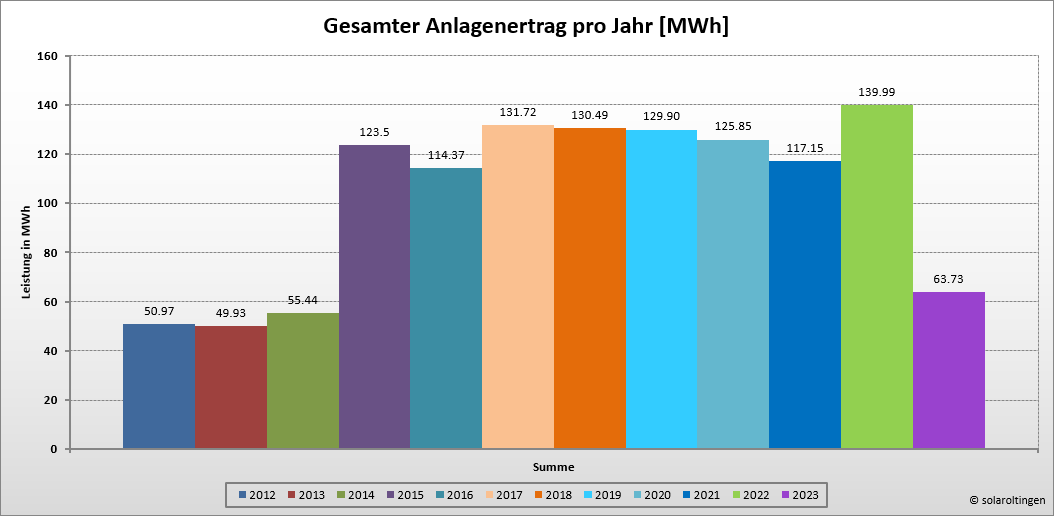 Aufgrund von Ausfällen in der Datenübertragung sind die Produktionswerte für Mai & Juni 2023 abgeschätzt aufgrund von Daten anderer Anlagen in der Region.