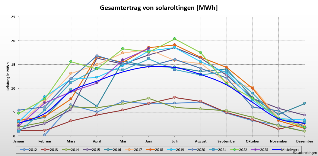 Aufgrund von Ausfällen in der Datenübertragung sind die Produktionswerte für Mai, Juni & Juli 2023 abgeschätzt aufgrund von Daten anderer Anlagen in der Region.