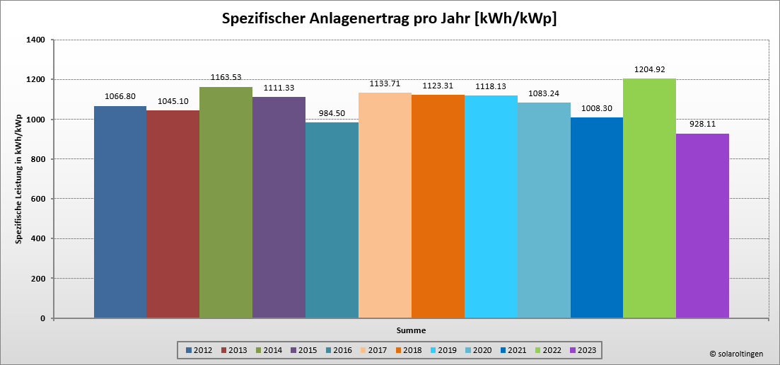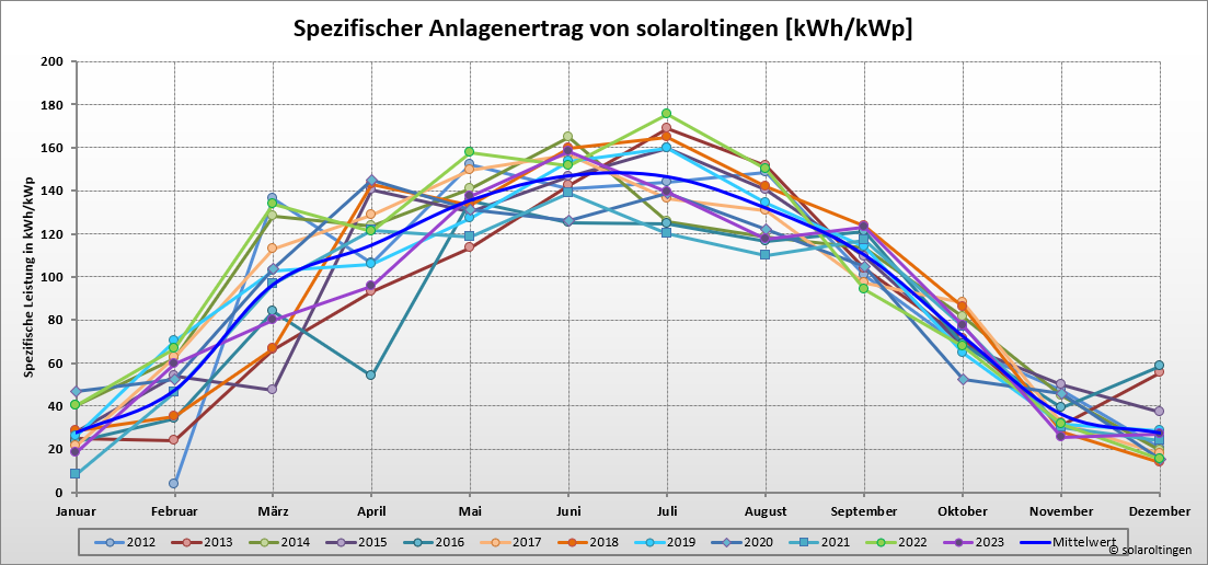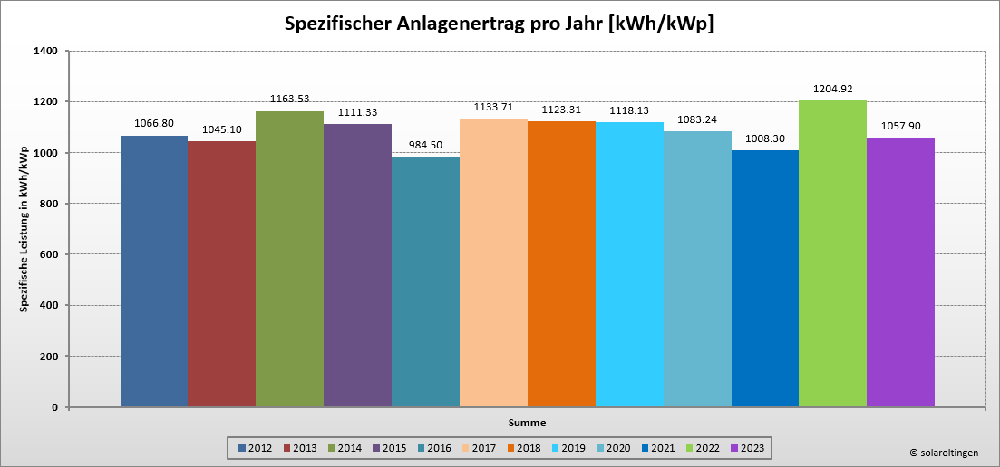 Aktualisierte Jahresvergleiche der Monats- und Jahresdaten des spezifischen Anlagenertrags, Stand 01. Januar 2024: