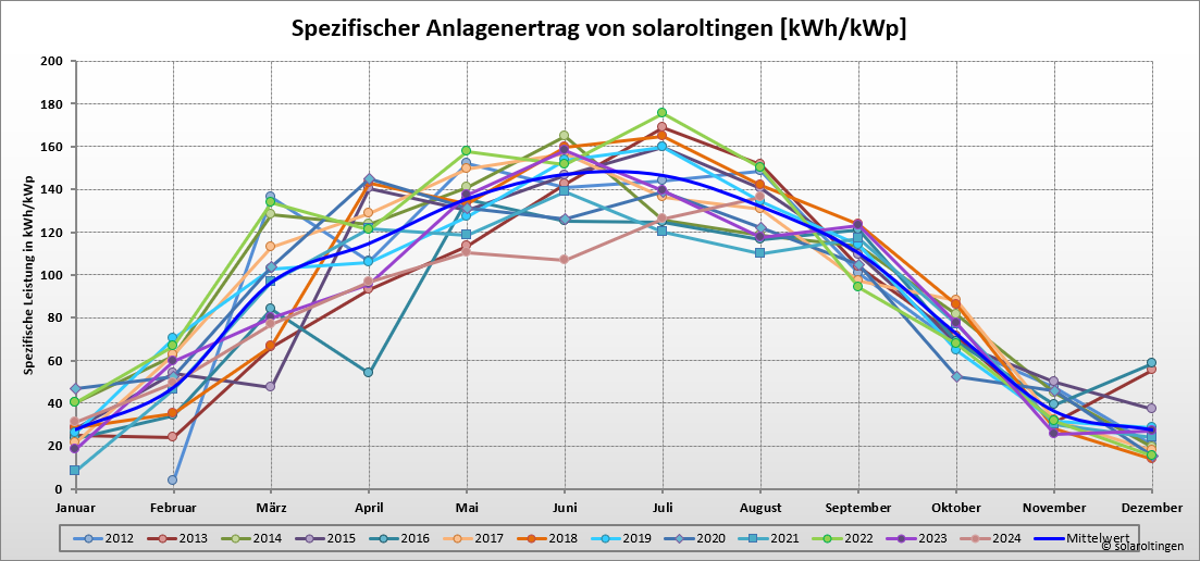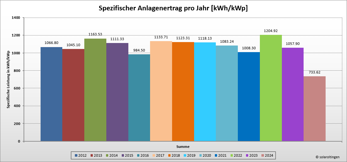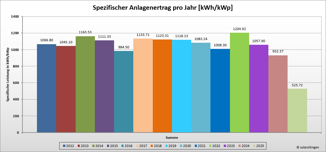 Aktualisierte Jahresvergleiche der Monats- und Jahresdaten des spezifischen Anlagenertrags, Stand 01. Januar 2025: