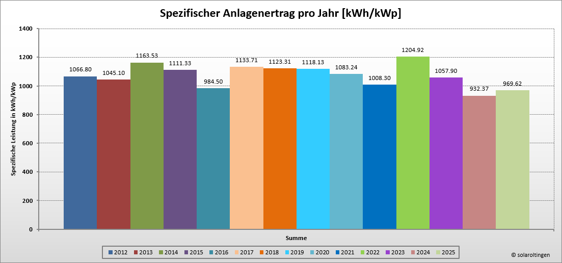Aktualisierte Jahresvergleiche der Monats- und Jahresdaten des spezifischen Anlagenertrags, Stand 01. Januar 2026: