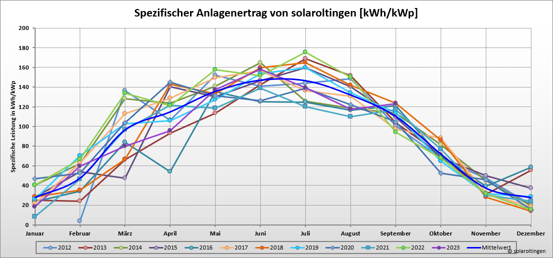Aktualisierte Jahresvergleiche der Monats- und Jahresdaten des spezifischen Anlagenertrags, Stand 01. Januar 2023: